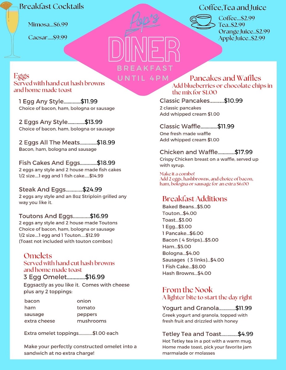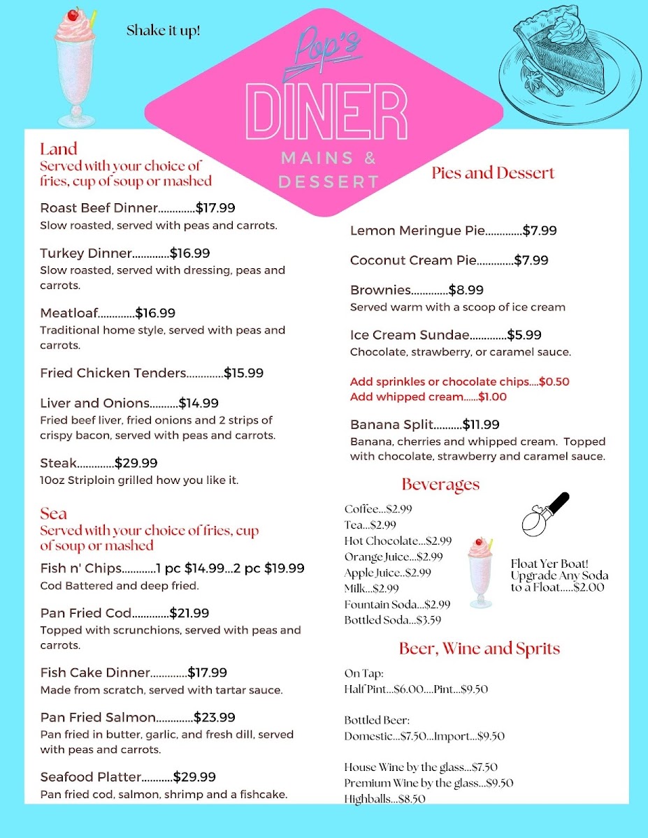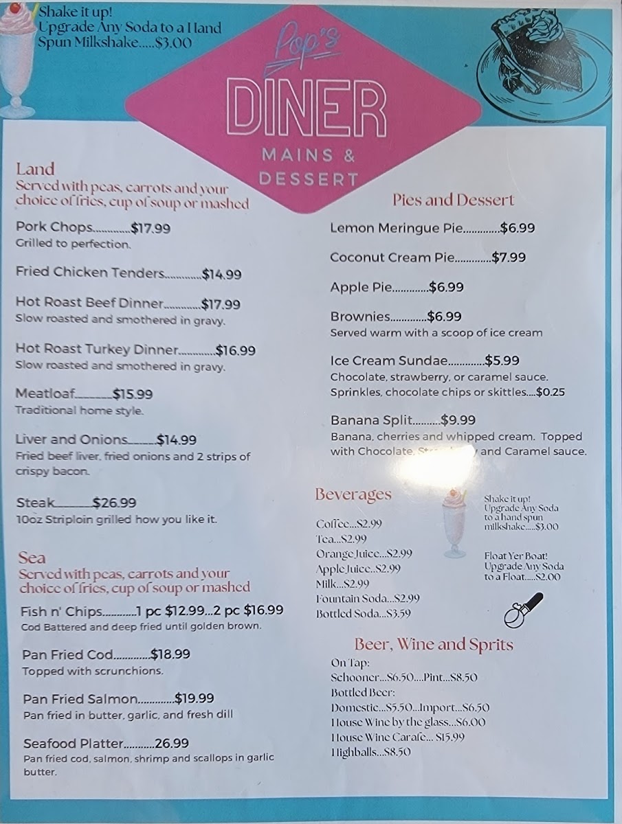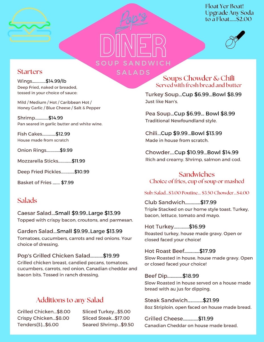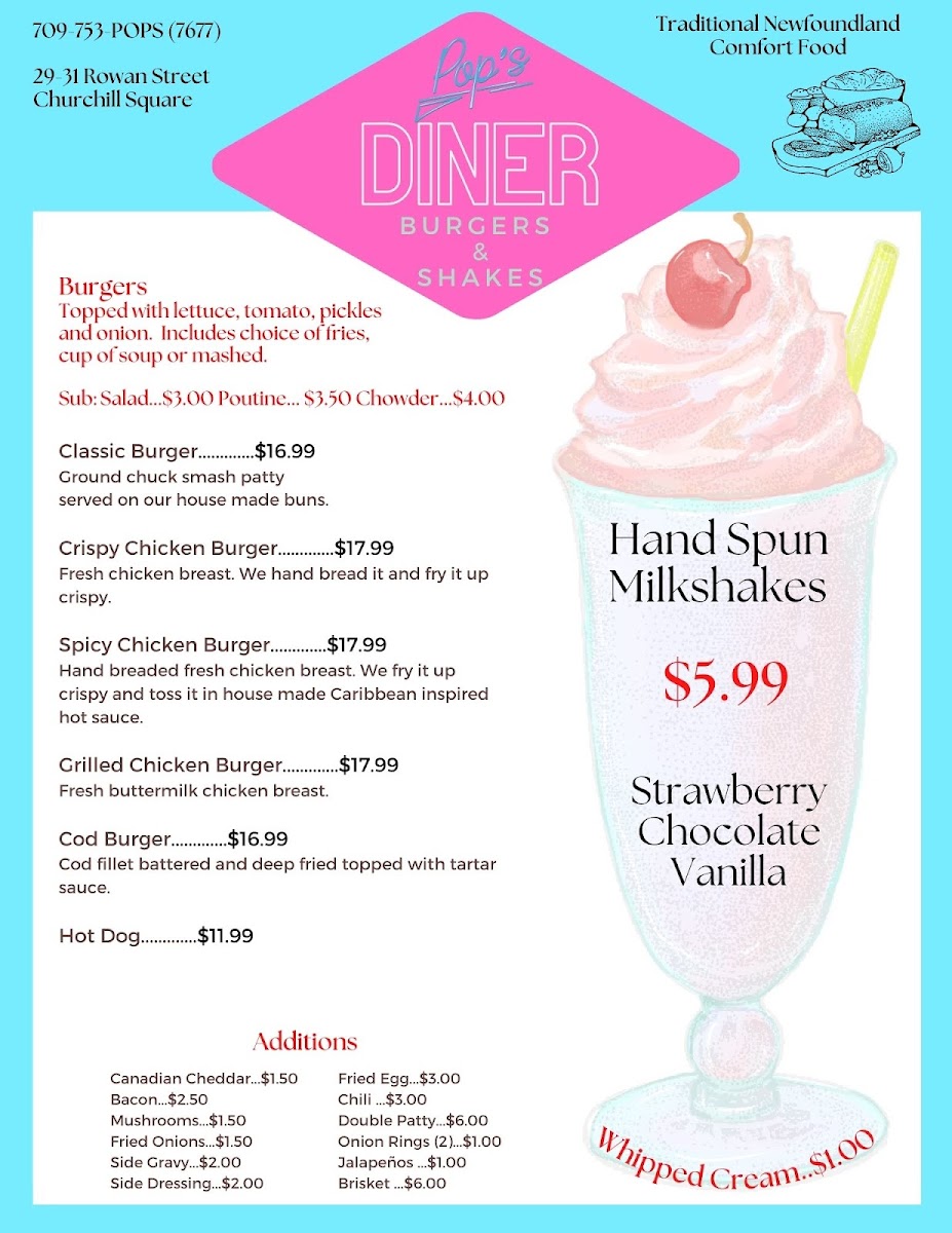 Welcome to Pop’s Diner, a vibrant gem nestled in St. John's, Newfoundland and Labrador, where the spirit of the 1950s comes alive amidst charming retro decor and the soothing sounds of a vintage jukebox. Since opening its doors in July 2022, this beloved eatery has quickly become a local favorite, renowned for its hearty, homemade comfort food and family-friendly atmosphere.